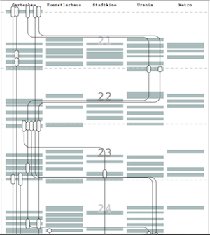 The Viennale is Vienna's largest movie festival. Each year for two weeks, there are hundreds of screenings in 5 cinemas. I wanted to track a group of movie enthusiasts chronologically throughout the festival. Each line is one person, connecting the screenings they attended. I asked them to give ratings from 1 to 10 for each movie and sized the boxes accordingly. The complete interactive version can be found here.